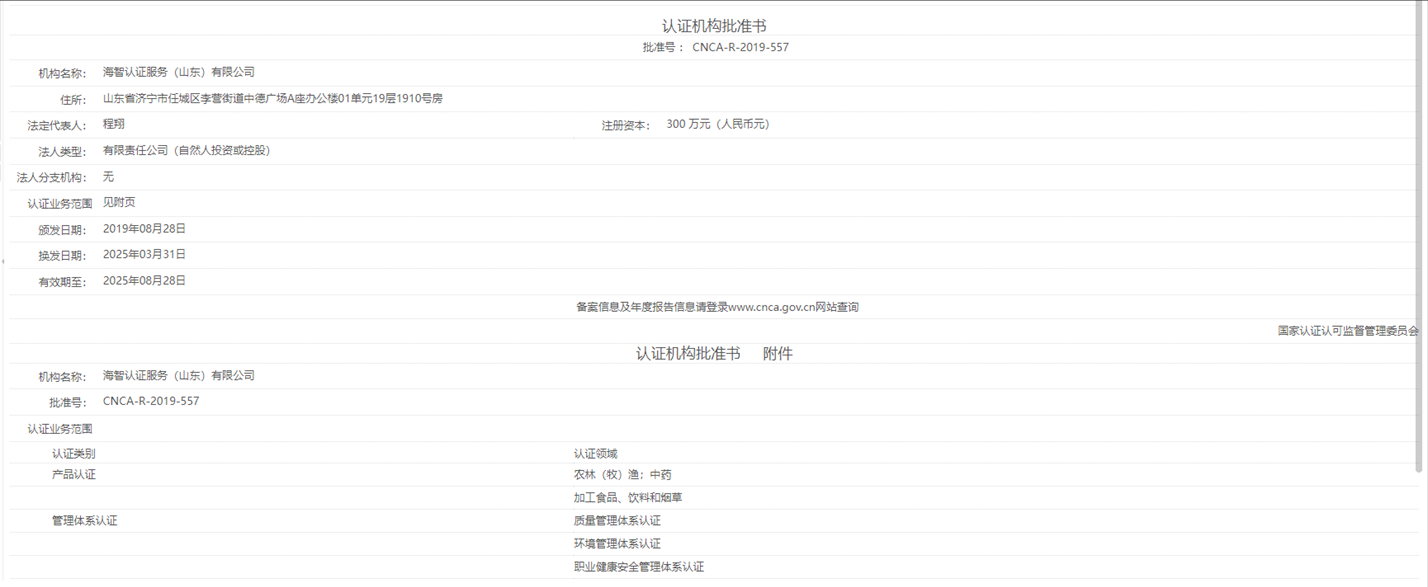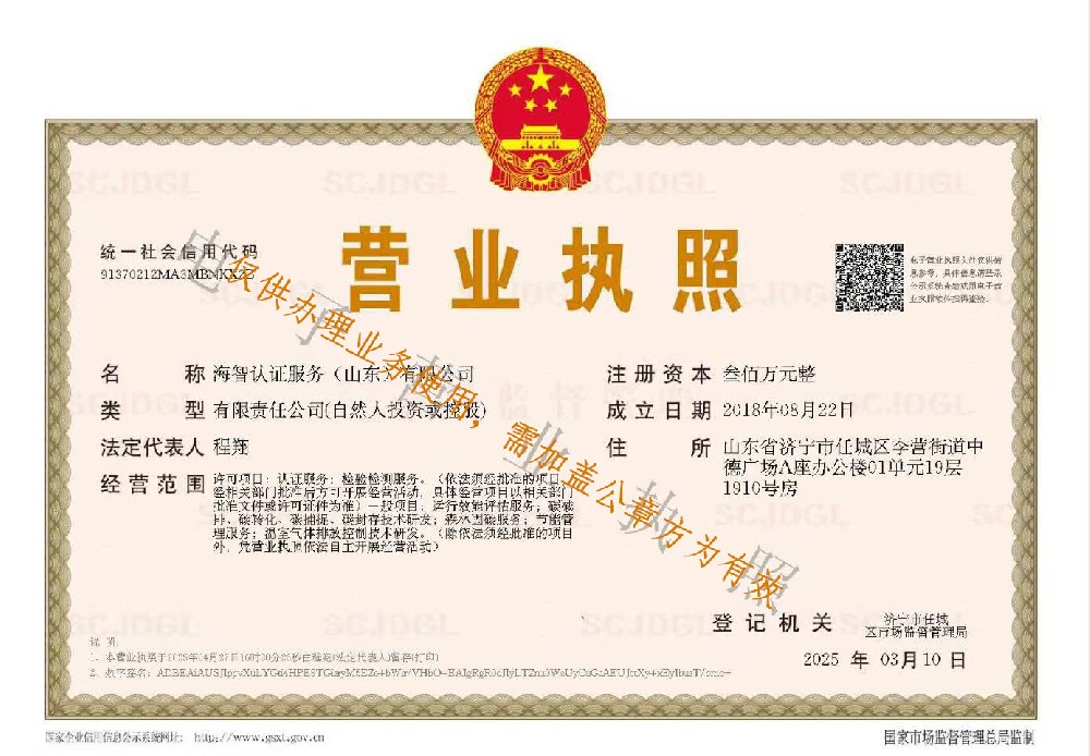 海智认证服务(山东)有限公司位于山东省济宁市任城区李营镇李营街道中德广场A座1910室,是经中国国家认证认可监督管理委员会(CNCA)批准(认证机构批准编号CNC A-R-2019-557)成立,具有独立法人资格的第三方权威认证机构。公司专注于为全国企业提供高效、合规、创新的认证解决方案,助力客户提升质量管理水平、增强市场竞争力。